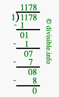 Here we will show you an image that illustrates how to calculate 1178 divided by 1 using long division. We will also give you the answer to 1178 divided by 1 (1178 ÷ 1) as a fraction and as a decimal.