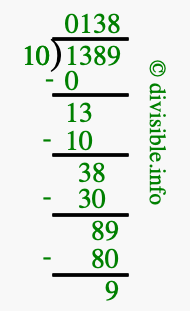 Here we will show you an image that illustrates how to calculate 1389 divided by 10 using long division. We will also give you the answer to 1389 divided by 10 (1389 ÷ 10) as a fraction and as a decimal.