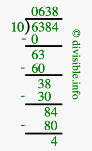 Here we will show you an image that illustrates how to calculate 6384 divided by 10 using long division. We will also give you the answer to 6384 divided by 10 (6384 ÷ 10) as a fraction and as a decimal.