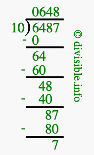 The image displays 648 at the top, which is the quotient, and 7 at the bottom, which is the remainder. Therefore, the answer to 6487 divided by 10 (6487 ÷ 10) using long division is 648 remainder 7, or simply 648 R 7.