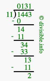 Here we will show you an image that illustrates how to calculate 1443 divided by 11 using long division. We will also give you the answer to 1443 divided by 11 (1443 ÷ 11) as a fraction and as a decimal.
