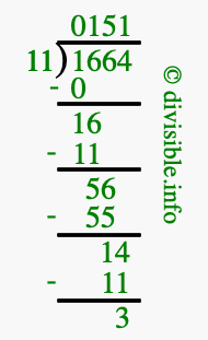 The image displays 151 at the top, which is the quotient, and 3 at the bottom, which is the remainder. Therefore, the answer to 1664 divided by 11 (1664 ÷ 11) using long division is 151 remainder 3, or simply 151 R 3.