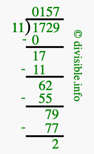 The image displays 157 at the top, which is the quotient, and 2 at the bottom, which is the remainder. Therefore, the answer to 1729 divided by 11 (1729 ÷ 11) using long division is 157 remainder 2, or simply 157 R 2.