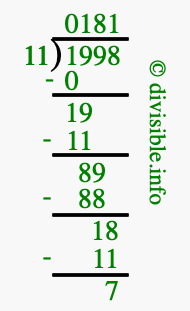 The image displays 181 at the top, which is the quotient, and 7 at the bottom, which is the remainder. Therefore, the answer to 1998 divided by 11 (1998 ÷ 11) using long division is 181 remainder 7, or simply 181 R 7.