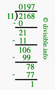 Now we will show you the answer to 2168 divided by 11 as a fraction, or more specifically, as a mixed fraction in its simplest form.