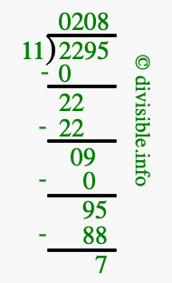 The image displays 208 at the top, which is the quotient, and 7 at the bottom, which is the remainder. Therefore, the answer to 2295 divided by 11 (2295 ÷ 11) using long division is 208 remainder 7, or simply 208 R 7.