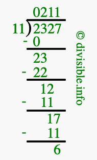 The image displays 211 at the top, which is the quotient, and 6 at the bottom, which is the remainder. Therefore, the answer to 2327 divided by 11 (2327 ÷ 11) using long division is 211 remainder 6, or simply 211 R 6.