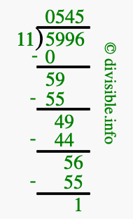 The image displays 545 at the top, which is the quotient, and 1 at the bottom, which is the remainder. Therefore, the answer to 5996 divided by 11 (5996 ÷ 11) using long division is 545 remainder 1, or simply 545 R 1.