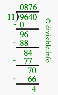 The image displays 876 at the top, which is the quotient, and 4 at the bottom, which is the remainder. Therefore, the answer to 9640 divided by 11 (9640 ÷ 11) using long division is 876 remainder 4, or simply 876 R 4.