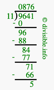 The image displays 876 at the top, which is the quotient, and 5 at the bottom, which is the remainder. Therefore, the answer to 9641 divided by 11 (9641 ÷ 11) using long division is 876 remainder 5, or simply 876 R 5.