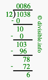 The image displays 86 at the top, which is the quotient, and 6 at the bottom, which is the remainder. Therefore, the answer to 1038 divided by 12 (1038 ÷ 12) using long division is 86 remainder 6, or simply 86 R 6.