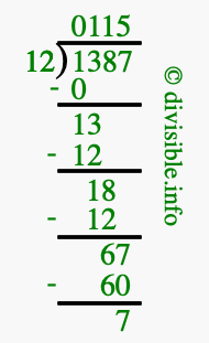 The image displays 115 at the top, which is the quotient, and 7 at the bottom, which is the remainder. Therefore, the answer to 1387 divided by 12 (1387 ÷ 12) using long division is 115 remainder 7, or simply 115 R 7.