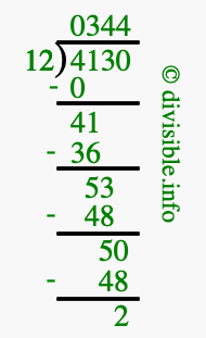 The image displays 344 at the top, which is the quotient, and 2 at the bottom, which is the remainder. Therefore, the answer to 4130 divided by 12 (4130 ÷ 12) using long division is 344 remainder 2, or simply 344 R 2.