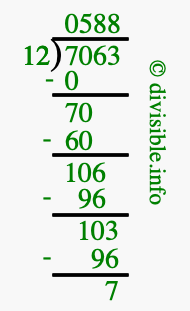 The image displays 588 at the top, which is the quotient, and 7 at the bottom, which is the remainder. Therefore, the answer to 7063 divided by 12 (7063 ÷ 12) using long division is 588 remainder 7, or simply 588 R 7.