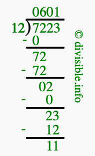The image displays 601 at the top, which is the quotient, and 11 at the bottom, which is the remainder. Therefore, the answer to 7223 divided by 12 (7223 ÷ 12) using long division is 601 remainder 11, or simply 601 R 11.