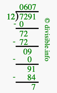 The image displays 607 at the top, which is the quotient, and 7 at the bottom, which is the remainder. Therefore, the answer to 7291 divided by 12 (7291 ÷ 12) using long division is 607 remainder 7, or simply 607 R 7.