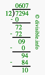 The image displays 607 at the top, which is the quotient, and 10 at the bottom, which is the remainder. Therefore, the answer to 7294 divided by 12 (7294 ÷ 12) using long division is 607 remainder 10, or simply 607 R 10.