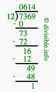 The image displays 614 at the top, which is the quotient, and 1 at the bottom, which is the remainder. Therefore, the answer to 7369 divided by 12 (7369 ÷ 12) using long division is 614 remainder 1, or simply 614 R 1.
