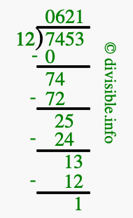 The image displays 621 at the top, which is the quotient, and 1 at the bottom, which is the remainder. Therefore, the answer to 7453 divided by 12 (7453 ÷ 12) using long division is 621 remainder 1, or simply 621 R 1.