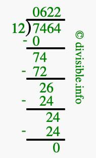 The image displays 622 at the top, which is the quotient, and 0 at the bottom, which is the remainder. Therefore, the answer to 7464 divided by 12 (7464 ÷ 12) using long division is 622 remainder 0, or simply 622 R 0.