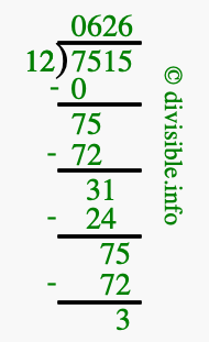 The image displays 626 at the top, which is the quotient, and 3 at the bottom, which is the remainder. Therefore, the answer to 7515 divided by 12 (7515 ÷ 12) using long division is 626 remainder 3, or simply 626 R 3.