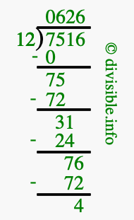 The image displays 626 at the top, which is the quotient, and 4 at the bottom, which is the remainder. Therefore, the answer to 7516 divided by 12 (7516 ÷ 12) using long division is 626 remainder 4, or simply 626 R 4.
