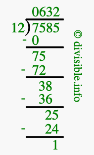 The image displays 632 at the top, which is the quotient, and 1 at the bottom, which is the remainder. Therefore, the answer to 7585 divided by 12 (7585 ÷ 12) using long division is 632 remainder 1, or simply 632 R 1.