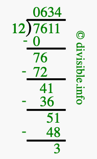 The image displays 634 at the top, which is the quotient, and 3 at the bottom, which is the remainder. Therefore, the answer to 7611 divided by 12 (7611 ÷ 12) using long division is 634 remainder 3, or simply 634 R 3.