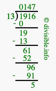 The image displays 147 at the top, which is the quotient, and 5 at the bottom, which is the remainder. Therefore, the answer to 1916 divided by 13 (1916 ÷ 13) using long division is 147 remainder 5, or simply 147 R 5.