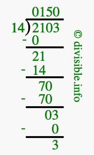 The image displays 150 at the top, which is the quotient, and 3 at the bottom, which is the remainder. Therefore, the answer to 2103 divided by 14 (2103 ÷ 14) using long division is 150 remainder 3, or simply 150 R 3.