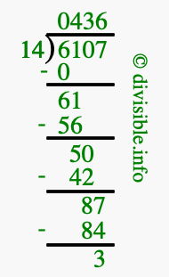 The image displays 436 at the top, which is the quotient, and 3 at the bottom, which is the remainder. Therefore, the answer to 6107 divided by 14 (6107 ÷ 14) using long division is 436 remainder 3, or simply 436 R 3.