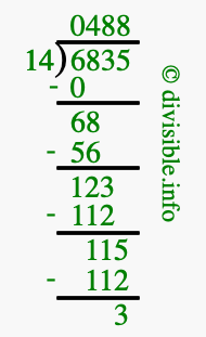 The image displays 488 at the top, which is the quotient, and 3 at the bottom, which is the remainder. Therefore, the answer to 6835 divided by 14 (6835 ÷ 14) using long division is 488 remainder 3, or simply 488 R 3.