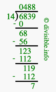 The image displays 488 at the top, which is the quotient, and 7 at the bottom, which is the remainder. Therefore, the answer to 6839 divided by 14 (6839 ÷ 14) using long division is 488 remainder 7, or simply 488 R 7.