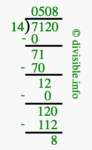 The image displays 508 at the top, which is the quotient, and 8 at the bottom, which is the remainder. Therefore, the answer to 7120 divided by 14 (7120 ÷ 14) using long division is 508 remainder 8, or simply 508 R 8.