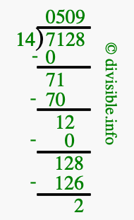 The image displays 509 at the top, which is the quotient, and 2 at the bottom, which is the remainder. Therefore, the answer to 7128 divided by 14 (7128 ÷ 14) using long division is 509 remainder 2, or simply 509 R 2.