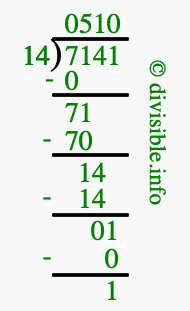 The image displays 510 at the top, which is the quotient, and 1 at the bottom, which is the remainder. Therefore, the answer to 7141 divided by 14 (7141 ÷ 14) using long division is 510 remainder 1, or simply 510 R 1.