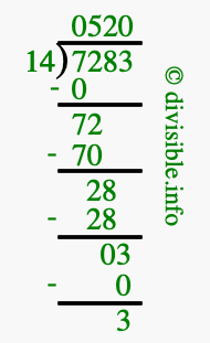 The image displays 520 at the top, which is the quotient, and 3 at the bottom, which is the remainder. Therefore, the answer to 7283 divided by 14 (7283 ÷ 14) using long division is 520 remainder 3, or simply 520 R 3.