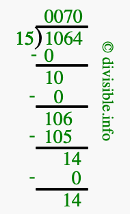 The image displays 70 at the top, which is the quotient, and 14 at the bottom, which is the remainder. Therefore, the answer to 1064 divided by 15 (1064 ÷ 15) using long division is 70 remainder 14, or simply 70 R 14.