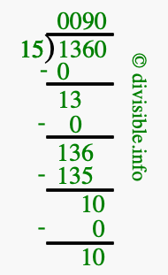 Here we will show you an image that illustrates how to calculate 1360 divided by 15 using long division. We will also give you the answer to 1360 divided by 15 (1360 ÷ 15) as a fraction and as a decimal.