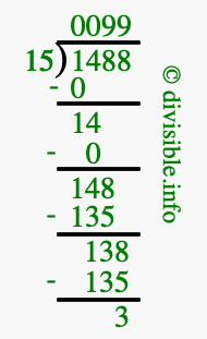 The image displays 99 at the top, which is the quotient, and 3 at the bottom, which is the remainder. Therefore, the answer to 1488 divided by 15 (1488 ÷ 15) using long division is 99 remainder 3, or simply 99 R 3.