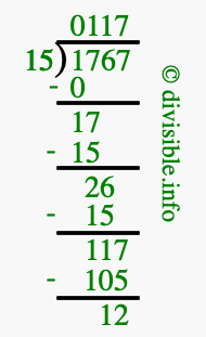 The image displays 117 at the top, which is the quotient, and 12 at the bottom, which is the remainder. Therefore, the answer to 1767 divided by 15 (1767 ÷ 15) using long division is 117 remainder 12, or simply 117 R 12.