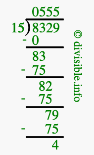 The image displays 555 at the top, which is the quotient, and 4 at the bottom, which is the remainder. Therefore, the answer to 8329 divided by 15 (8329 ÷ 15) using long division is 555 remainder 4, or simply 555 R 4.