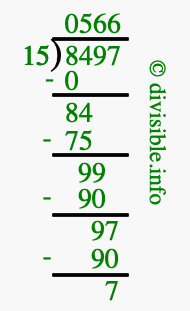 The image displays 566 at the top, which is the quotient, and 7 at the bottom, which is the remainder. Therefore, the answer to 8497 divided by 15 (8497 ÷ 15) using long division is 566 remainder 7, or simply 566 R 7.