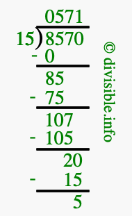 The image displays 571 at the top, which is the quotient, and 5 at the bottom, which is the remainder. Therefore, the answer to 8570 divided by 15 (8570 ÷ 15) using long division is 571 remainder 5, or simply 571 R 5.