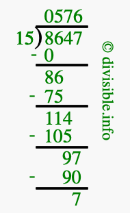 The image displays 576 at the top, which is the quotient, and 7 at the bottom, which is the remainder. Therefore, the answer to 8647 divided by 15 (8647 ÷ 15) using long division is 576 remainder 7, or simply 576 R 7.