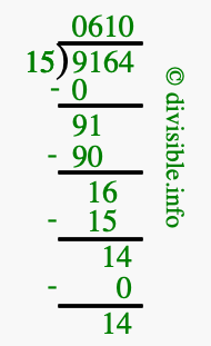 The image displays 610 at the top, which is the quotient, and 14 at the bottom, which is the remainder. Therefore, the answer to 9164 divided by 15 (9164 ÷ 15) using long division is 610 remainder 14, or simply 610 R 14.