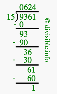The image displays 624 at the top, which is the quotient, and 1 at the bottom, which is the remainder. Therefore, the answer to 9361 divided by 15 (9361 ÷ 15) using long division is 624 remainder 1, or simply 624 R 1.