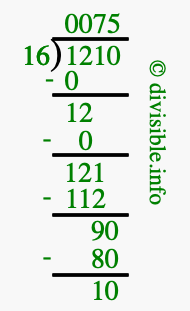 The image displays 75 at the top, which is the quotient, and 10 at the bottom, which is the remainder. Therefore, the answer to 1210 divided by 16 (1210 ÷ 16) using long division is 75 remainder 10, or simply 75 R 10.