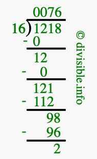 Here we will show you an image that illustrates how to calculate 1218 divided by 16 using long division. We will also give you the answer to 1218 divided by 16 (1218 ÷ 16) as a fraction and as a decimal.