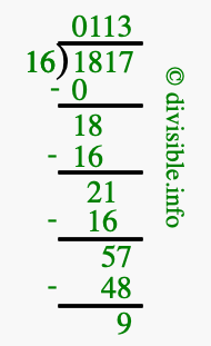 The image displays 113 at the top, which is the quotient, and 9 at the bottom, which is the remainder. Therefore, the answer to 1817 divided by 16 (1817 ÷ 16) using long division is 113 remainder 9, or simply 113 R 9.